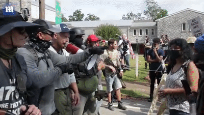 当白人右翼团体成员手持武器聚集到石山公园附近时,反对种族歧视的示威群众也赶到现场,他们当中也有人拿着武器。双方起初只是对峙,现场也看不到警察维持秩序。但个把小时后,双方的对峙达到了沸点,从一开始的推推搡搡到后来拳打脚踢,互扔石块儿,有人被打翻在地。此时,警察才赶来维持秩序,大批国民警卫队也随即赶到增援。
