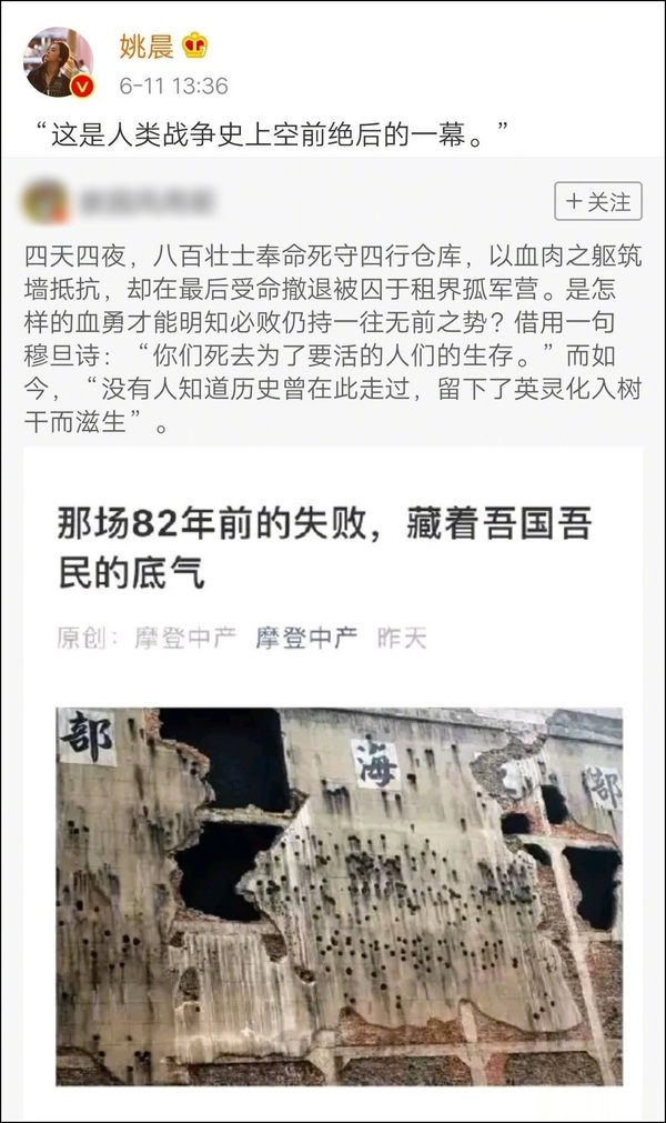 据了解,姚晨去年6月11日曾转发他人一则谈论四行仓库保卫战的微博,并配文“这是人类战争史上空前绝后的一幕”。日前,这则微博重新被网友翻了出来,并称这是姚晨在给该次战役定性了。