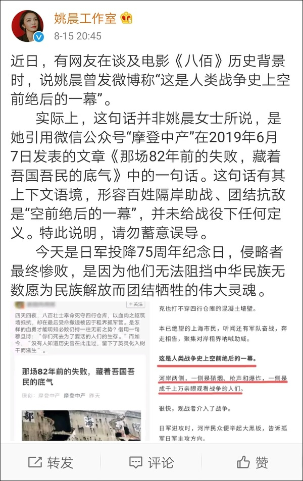 对此,姚晨工作室于8月15日晚澄清表示,姚晨早前的微博只是对于自媒体文章的引用,并没有对四行仓库保卫战进行定性。