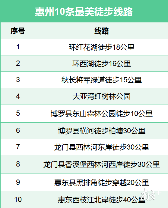 城在山水中,家在花园里。集山、江、湖、海、泉、岛于一体的惠州,坐拥好山好水好空气,可谓“天生丽质”,有不少适合徒步的绝佳去处。