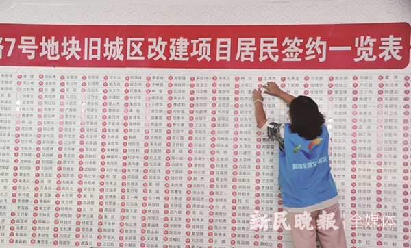 图说:8月16日上午,南京东路街道三德居民区党总支书记忻梅影在签约墙前查看居民签约情况。(杨建正 摄 下同)