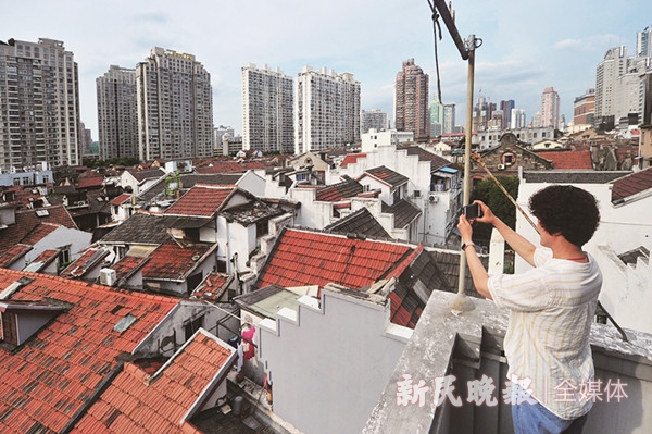 图说:一位居民在家中5楼晒台上用手机拍摄这片即将消逝的老房子,留下永久的记忆。