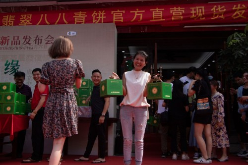 时至今天,在这个全国最大的普洱茶集散地,举行中茶翡翠八八青饼官方限购签售会。现场空前火爆、人声鼎沸,排着蜿蜒曲折的长队,真的堪称“寸步难行”。更有不远千里而来的客户,都是一饼难求。散提签售,整件产品拆箱售卖,直接触达c端消费者,这种营销模式的探索取得了良好的效果,在实践中不断进步完善。