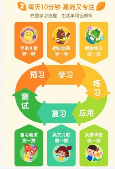 通过形象生动,剧情简单的课后练习小游戏,让孩子反复强化记忆。对话内容重复性高,贴近日常生活,使用频率高,效果显著。