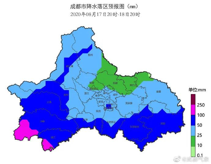 成都市气象台8月17日16时00分将16日16时00分发布的暴雨橙色预警降为暴雨蓝色预警:预计17日20时到18日20时,崇州、大邑、邛崃、蒲江、新津、天府新区、东部新区和简阳的部分地方有暴雨,个别地方有大暴雨;彭州、都江堰、双流、主城区和金堂有分散暴雨,其余区(市)县有中雨到大雨,中东部偏北风4~6级,山口河谷阵风可达7级或以上,请加强防范。