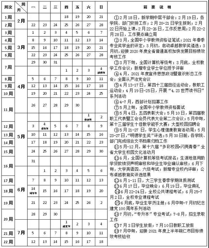 备注:法定假日放假安排,以国务院通知为准;以上工作安排,如有变化以学校通知为准。