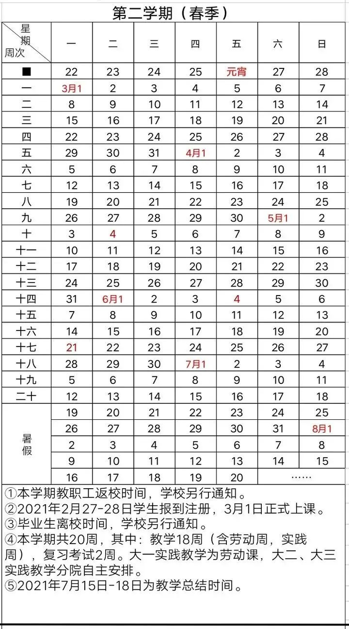 2020-2021学年第二学期校历: