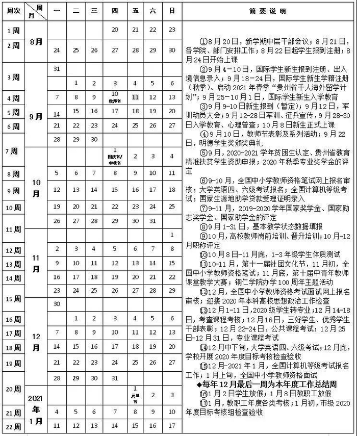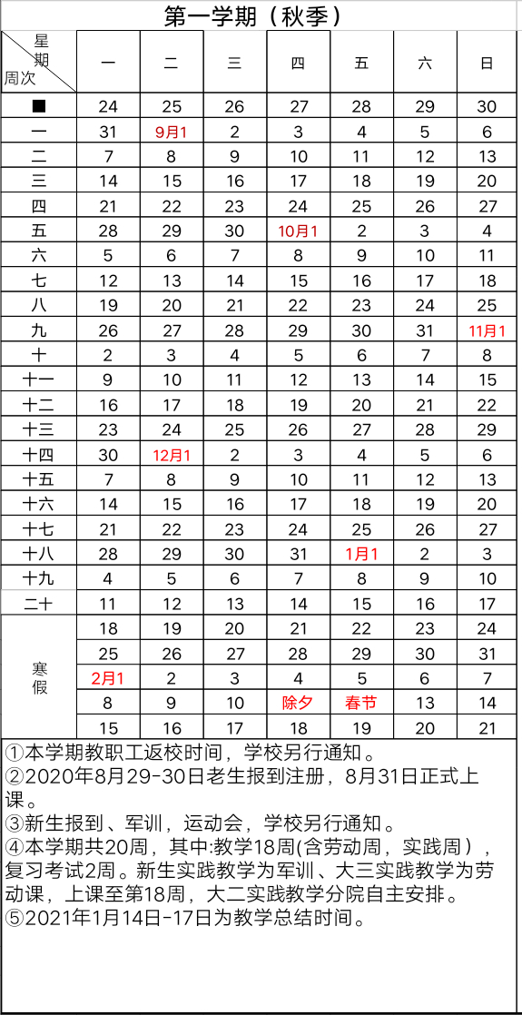 2020-2021学年第一学期校历:
