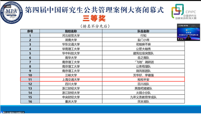同时,才遍神州队(案例名称:从梳离排斥到包容共享:街道艺人的共享舞台;指导老师:吕晓俊;参赛同学:管乐、崔媛媛、丁家桢、郭圣洁、王文杰)、浪漫天涯队(案例名称:“海上游天涯”走出公地悲剧——社会治理新格局构建的三亚实践;指导老师:姜文宁;参赛同学:朱志兴、牛晶晶、冉才、路培、余成龙)和思源致远队(案例名称:从“魍红”到“网红”——永康路放管服的精准施策之路;指导老师:章伟;参赛同学:戴炯玥、方逸云、卜希敏、顾姚劼、马玲)获得本次大赛优秀奖。