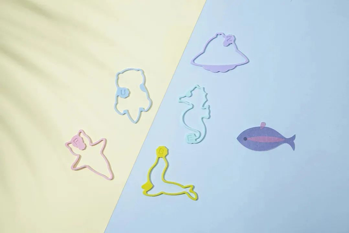 不同的造型搭配不同的颜色:粉绿海马、粉色蝴蝶、蓝色小鸟、黄色海豚等等。