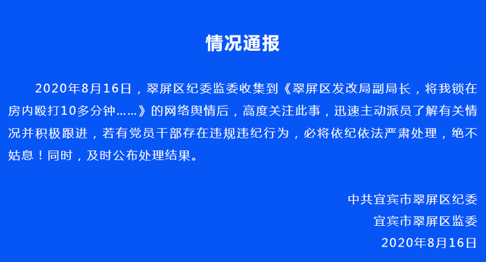之后,记者联系中共宜宾市纪委,一名工作人员表示“目前仍在调查中,需要时间,有进展会及时通报。”