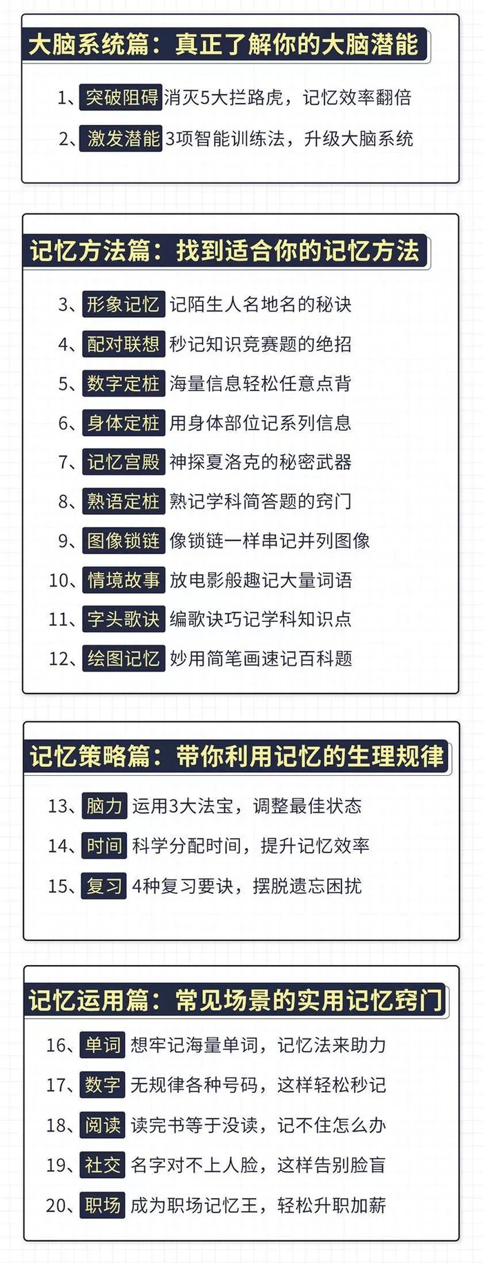 所以这一次袁文魁老师,整合了万元线下面授课程的精华,并根据日常教学经验总结了一套普通人学了就能立马用得上的实用记忆术——《最强大脑冠军教练亲授:20堂超实用记忆术,教你快速记住任何信息!》。