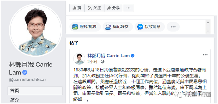 8月18日,香港特区行政长官林郑月娥在社交网站上发文,深情回忆了自己长达40年的“公仆”生涯。