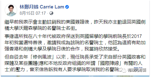 面对乱局,林郑特首没有消极也从未放弃。在7月1日庆香港回归酒会上,人们看见了摘口罩唱国歌、哽咽致辞的林郑特首,那一句“感谢中央支持,相信办法总比困难多”让多少人潸然泪下!面对美国的制裁,林郑特首说,自己已经被“点名”,但她并不害怕,因为自己在美国没有资产,也不向往去美国。面对英国的乖张,林郑特首主动退回剑桥大学的名誉院士名衔,并义正言辞不卑不亢地在社交媒体发文对事情的原委和英国政客的嘴脸进行了揭露。