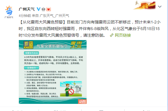 目前南沙区台风黄色预警信号,越秀、天河、荔湾、海珠、黄埔、番禺区台风蓝色预警信号和白云、花都、增城区台风白色预警信号正在生效中,广州港1-2号港区台风信号3号风球、3-4号港区台风信号2号风球也在生效,请继续做好防御工作。(广州市气象台8月18日18时00分发布)