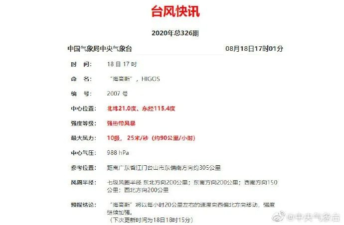 据@广州天气,18日17时,今年第7号台风“海高斯”加强为强热带风暴级,其中心位于广州市东南方向约250公里的海面上,也就是在北纬21.0度、东经115.4度,中心附近最大风力10级(25米/秒),中心最低气压988百帕。