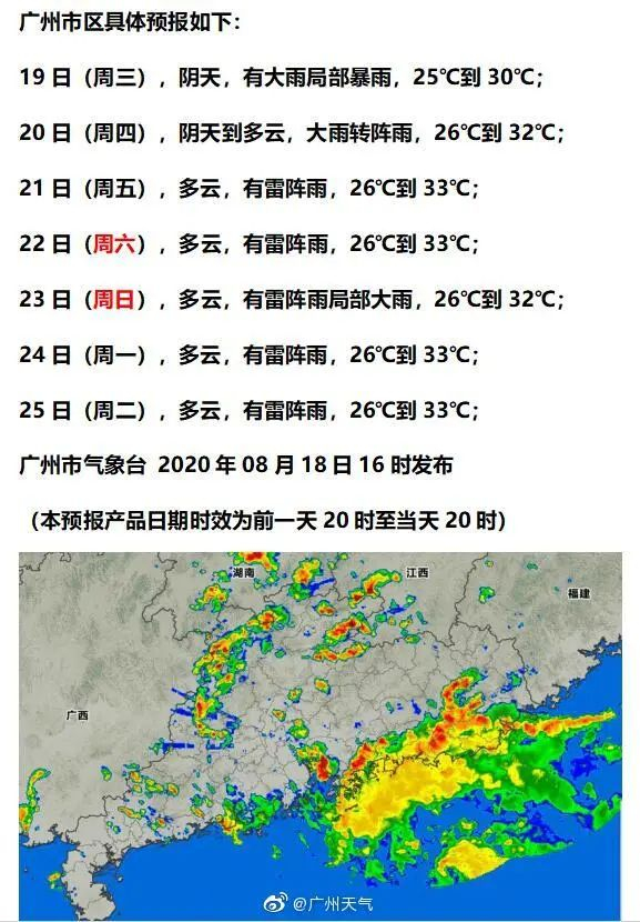 广州19日,阴天,有大雨局部暴雨,气温介于25到30℃之间,相对湿度介于75~97%之间,吹轻劲的东北风;