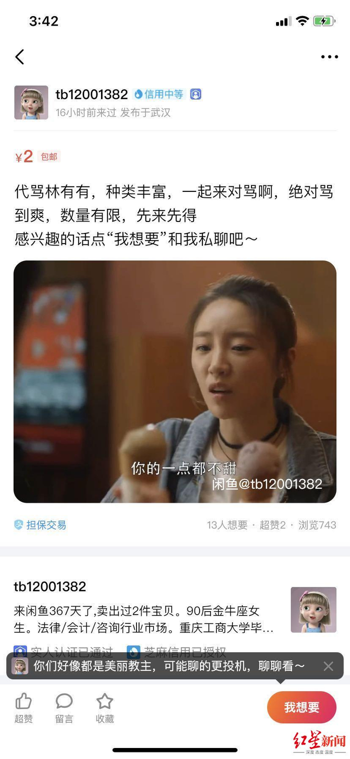 近日,在二手线上购物平台在闲鱼上,红星新闻找到了多个“陪骂林有有”的购买链接。陪骂价格从2元到10元不等。