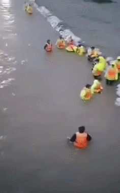 致敬!四川德阳特警在齐腰深水中装填沙袋守护堤坝。