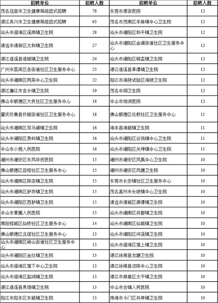有50多家基层医疗卫生机构拿出10个以上的编制招聘人才:信宜市卫生健康局组团辖区内的基层医疗卫生机构招聘78人、吴川市卫生健康局组团辖区内的基层医疗卫生机构招聘63人;汕头市澄海区溪南镇卫生院招聘28人、清远市清新区太和镇卫生院招聘27人、遂溪县遂城镇卫生院招聘24人、汕头市潮南区两英中心卫生院招聘22人、廉江市吉水镇卫生院招聘19人;广州市荔湾区各街道社区卫生服务中心招聘23人、佛山市顺德区大良社区卫生服务中心招聘18人、中山市小榄人民医院招聘16人。其中聘10人以上乡镇卫生院/社区卫生服务中心有54家(见下表)。