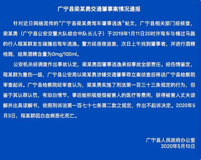 警方经连夜追查,次日上午找到肇事者,并进行酒精检测,结果酒精含量为0mg/100ml。公安机关经调查作出事故认定,梁某勇因肇事逃逸承担事故全部责任。经伤情鉴定,程某群为重伤一级,广宁县公安局以梁某勇涉嫌交通肇事罪立案侦查后移送广宁县检察院审查起诉。
