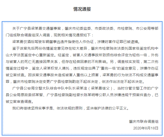 广宁县公安局交警大队综合中队中队长梁某淦(梁某勇继父)、当时分管交警工作的广宁县公安局原政委邱某智、广宁县检察院副检察长陈某明等公职人员涉嫌违规干预案件查办,已被立案审查调查。