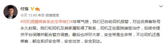 非常气愤,我们已协助司机报警,对这名乘客账号永久封禁。我们和司机及其家属取得了联系,司机正在医院接受治疗,后续会提供平台保障并配合警方调查。最后也呼吁大家,安全带是生命带,不论司机还是乘客,都应系好安全带,安全出发,安全到达。
