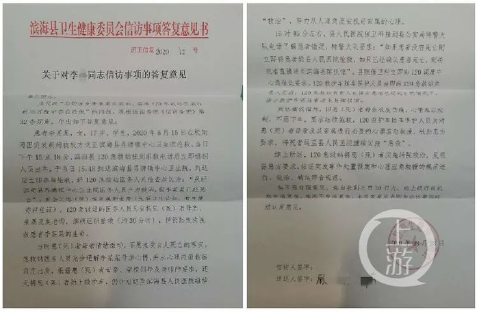 官方提供的信访回复内容显示:经调查,患者李某洁,6月15日在校期词因突发疾病被校方送至滨海县界脾镇中心卫生院抢救。当日15点18分,滨海县120急救站接到求救电话后立即组织人员出车,于当日15点48分到达界牌镇中心卫生院,到达后立即参与抢救,经120急救站医务人员检查后认为:“虽经滨海县界牌镇中心卫生院医务人员全力救治,但李某某已经死亡。120急救站的医务人员为安抚患(死)者母亲亲属及其老师,继续组织抢救约30分钟,但仍然无法挽救患者李某某的生命。