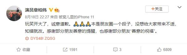 8月18日,德云社相声演员章绍伟在微博为自己发布的不正当言论道歉。