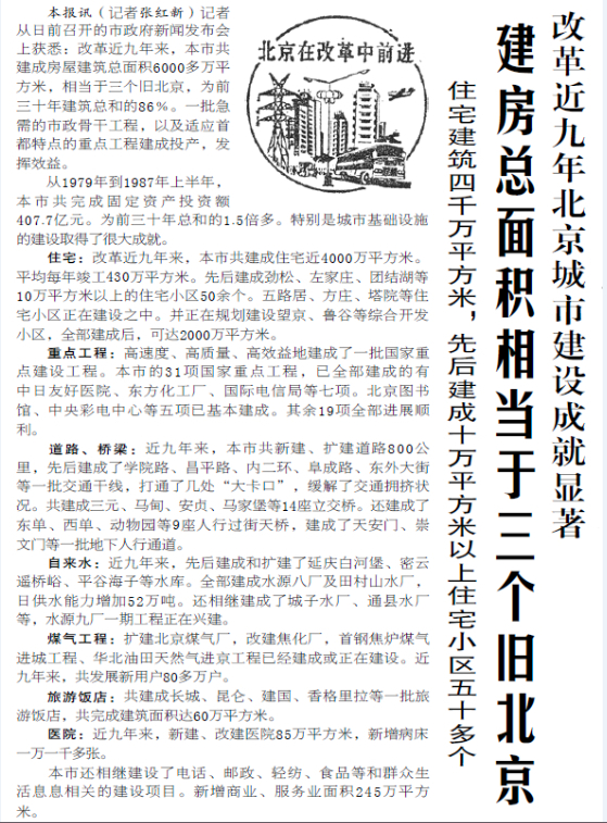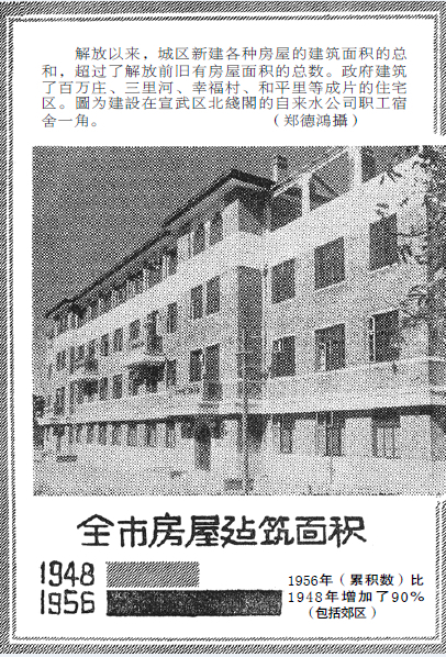 据本报1957年7月24日6版《全市房屋建筑面积》报道,新中国成立以后,本市建设了百万庄、三里河、幸福村、和平里等成片的住宅区。城区新建各种房屋的建筑面积总和,超过了解放前旧有房屋面积的总数。1956年全市房屋建筑面积已经比1948年增加了90%(包括郊区)。