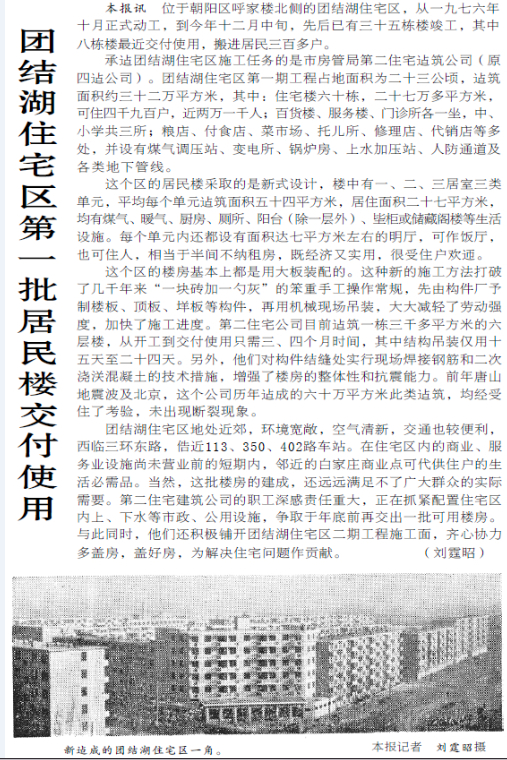 1976年,团结湖住宅区开建。一期工程共有住宅楼60栋,可住4900户人。住宅楼基本上都是用大板装配的。这种新的施工方法打破了之前一直以来“一块砖加一勺灰”的笨重手工操作办法,用机械吊装预制楼板等构件,大大加快了施工速度。
