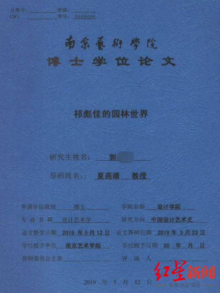 2019年5月,就读于南京艺术学院的郭某某提交了自己的博士学位论文《祁彪佳的园林世界》,后被豆瓣网友心匠发现内容有部分抄袭自己文章。经双方私下沟通后,心匠选择原谅郭某某。