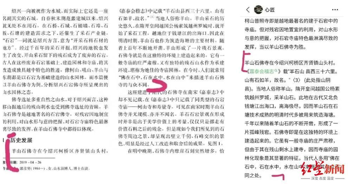 夏燕靖:有在网上看到,但并不清楚。网上被指抄袭的这篇文章(《绍兴石宕园林研究——以羊山石佛寺为例》)是她毕业以后发表的,她从没拿来给我看过,也没有从任何渠道给我讲过,之前我不知道有这篇文章的存在。严格来讲,和我们没有关系。