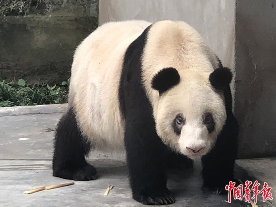 时间在这只长寿的大熊猫身上留下了不少痕迹:它标志性的黑鼻头、黑眼圈都有些许褪色,甚至略有发灰,让人喟叹“两鬓斑白”;它甚至有了“老年斑”,眼里隐隐有了白内障;它的牙齿曾经强健有力,咬合力与老虎、棕熊不相上下,而今有的掉、有的断,再也不复当年的好牙口;对秋千、溜索、滑梯这些玩具,它也意兴阑珊。