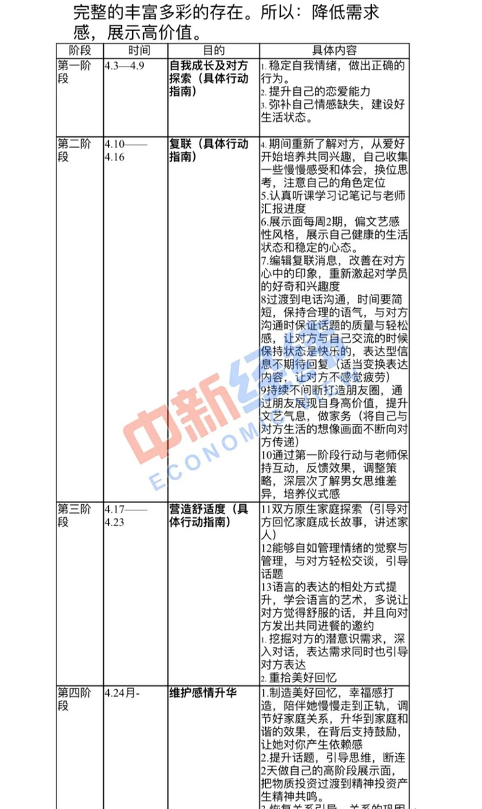 该方案中的“挽回思路”分为四个阶段,持续时长为一个月。其中,第一阶段用时一周时间,具体内容为“稳定自我情绪,做出正确的行为”等;第二周为“复联”时期,具体内容为“过渡到电话沟通,时间要简短,保持合理的语气”“持续不间断打造朋友圈,通过朋友展现自身高价值”等;第三周则为“营造舒适度”时期,要求“探索原生家庭”“重拾美好回忆”;最后阶段为“维护感情升华”时期,包括“提升话题”等内容。