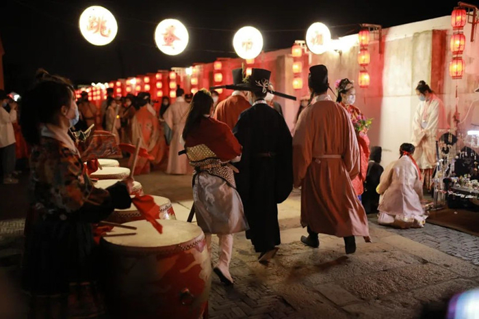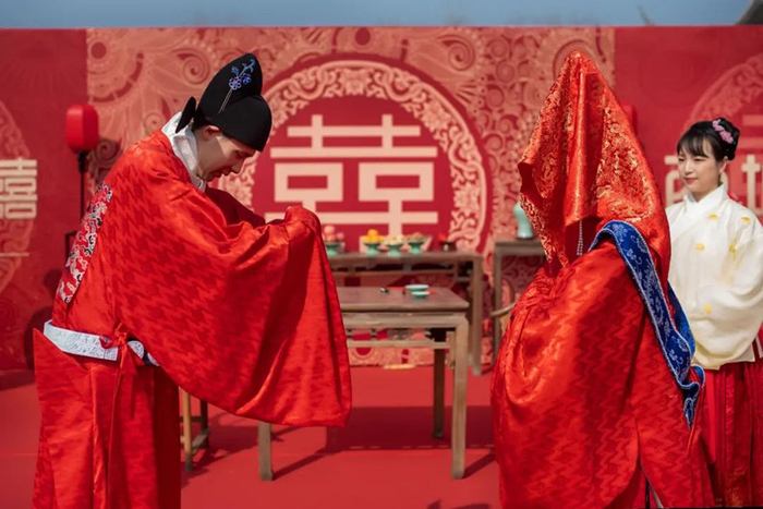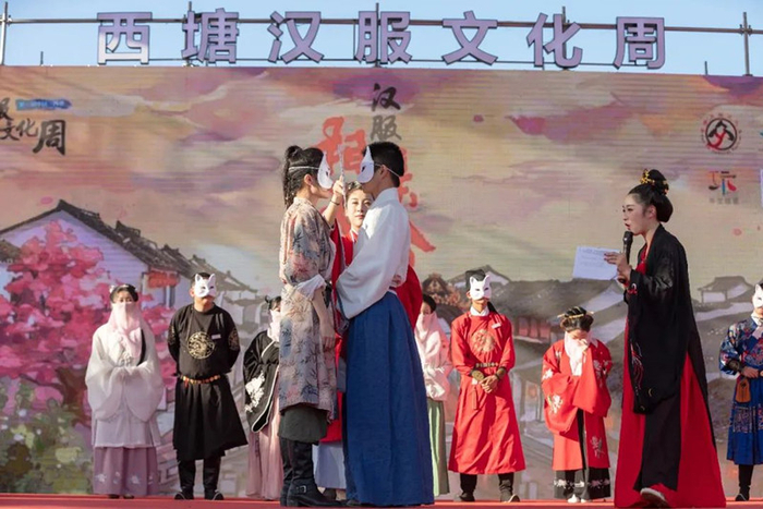 在七夕节期间,浙江省嘉兴市嘉善县西塘古镇为在新冠肺炎防治工作中辛勤付出的抗疫人员举办汉服传统婚礼,由汉服形象大使以“状元”“织女”的身份担任仪礼人员。
