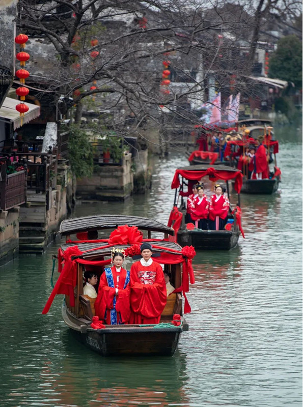 仪式结束后,新人们乘坐着张灯结彩的婚船行进在西塘河中,接受沿途游客朋友们的祝福。
