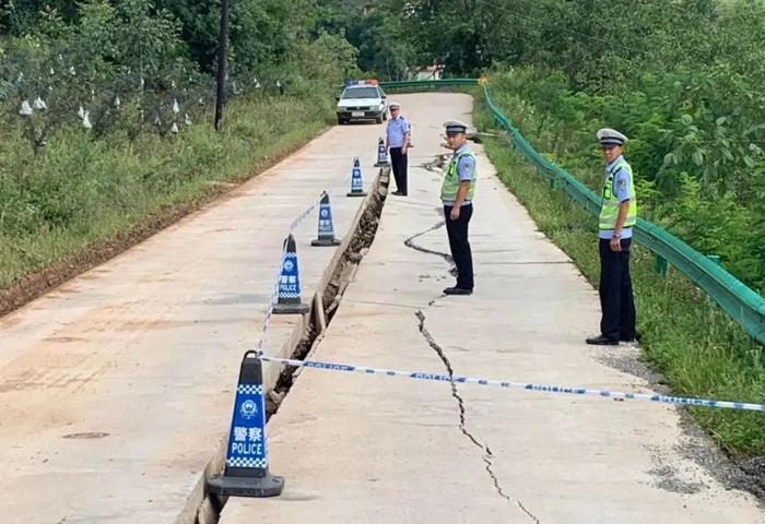 7、国道212线588km+300m(东坝三岔路口)县城东出口路段,路基出现裂缝,存在安全隐患,交警大队已在此处设置警示标志。