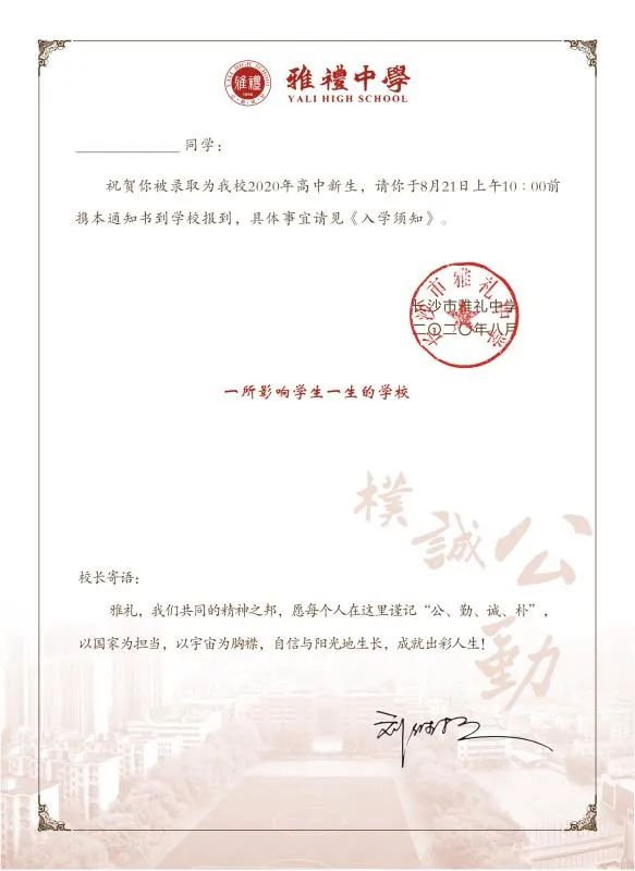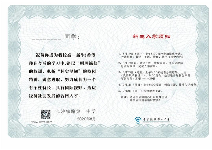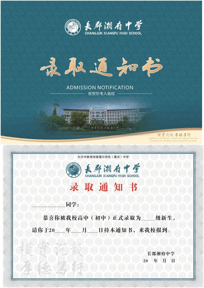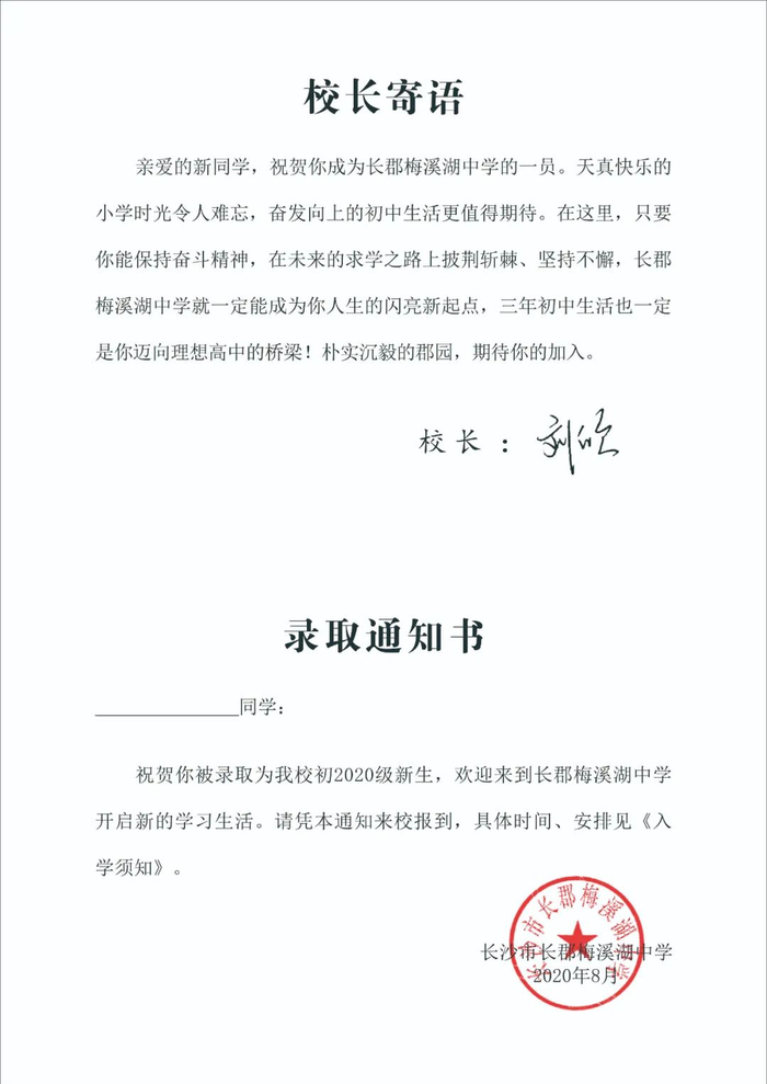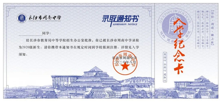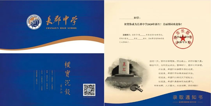 长郡湘府中学2020年录取通知书延续以往简约、大气风格。