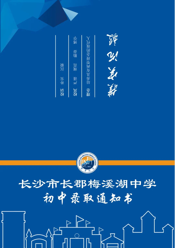 长郡梅溪湖中学录取通知书整体采用深蓝色调,点缀校徽中的黄色,画风简洁明快,体现鲜明的长郡特色。