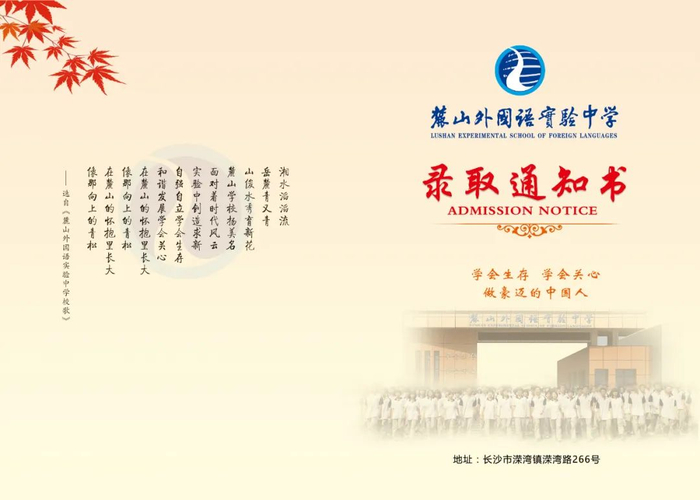 通知书还将校徽、校歌、校训和育人目标巧妙地布局在象征岳麓山的红叶点缀下的图画里,寓意“岳麓山下好读书”。