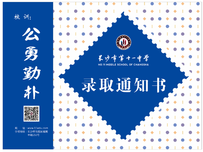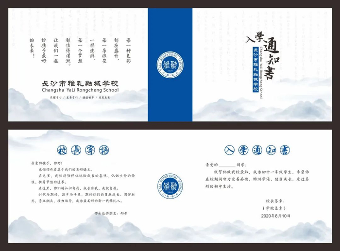 长沙市雅礼十五中学录取通知书设计风格简约大气,个性鲜明又不乏中国传统文化底蕴。