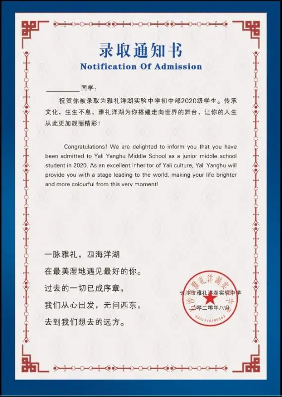 拿到通知书,映入眼帘的是特有的雅礼融城蓝。