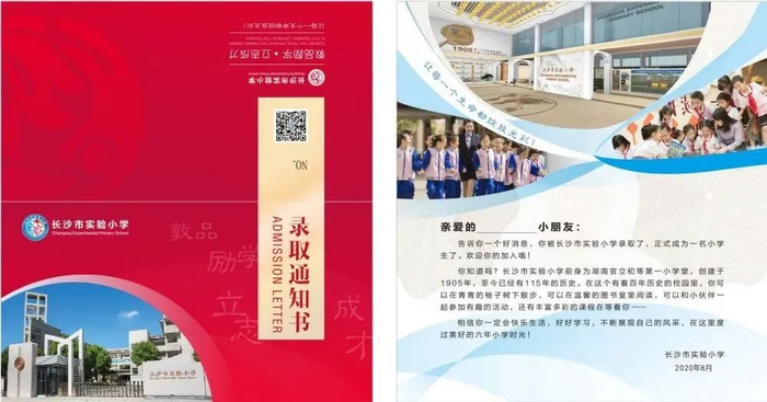 创建于1905年的长沙市实验小学,她的录取通知书以红、蓝为主色调,与学校校徽色调呼应。