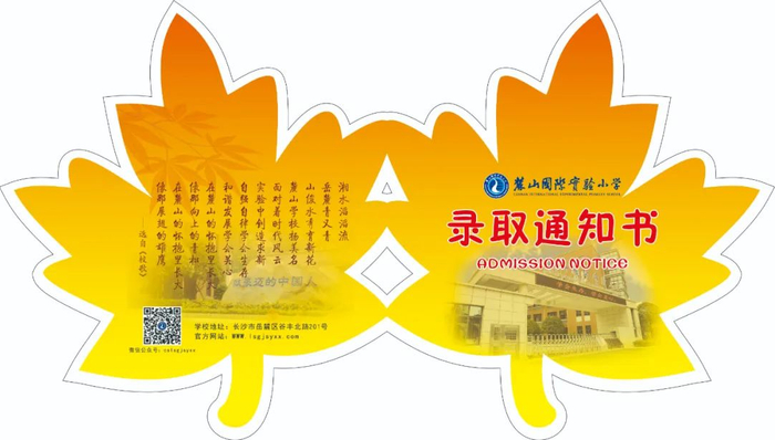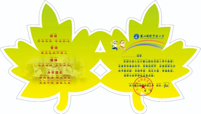 长沙麓山国际实验小学的通知书设计中,学校校训、誓词、精神、办学理念、校歌跃然纸上,麓小魅力与学校文化在“枫叶”录取通知书中默默地传递给家长与孩子。