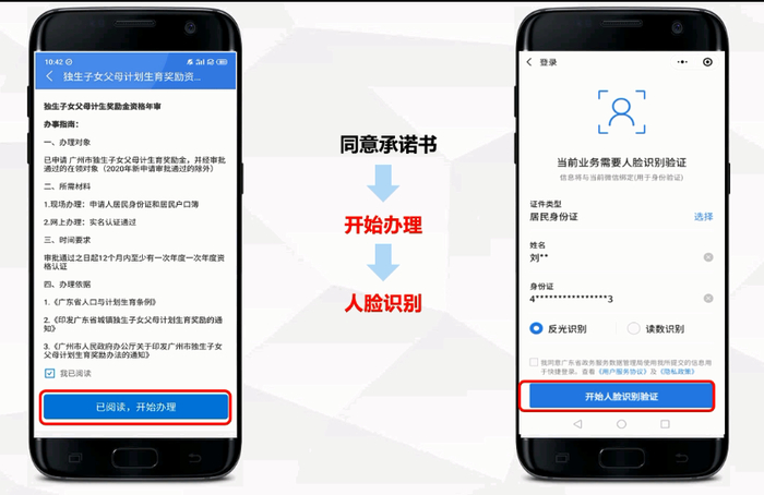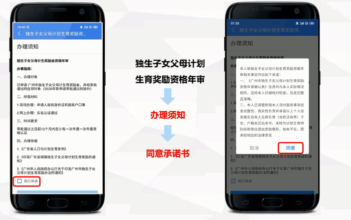 1、开始办理:点击“独生子女父母计划生育奖励”,阅读办事指南,勾选“我已认真阅读并同意《承诺书》”,点击“开始办理”。