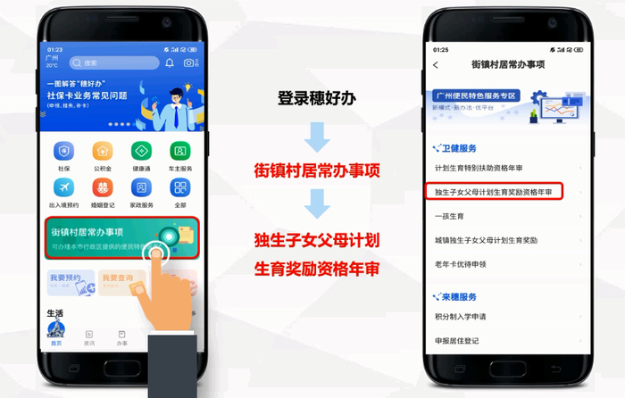 ② 打开“穗好办” APP-【首页】-【街镇村居常办事项】-【卫健服务】-【独生子女父母计划生育奖励资格年审/计划生育特别扶助资格年审】