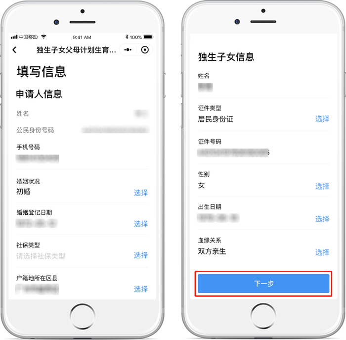 2、填写申请信息:填写申请人、配偶以及独生子女信息,点击“下一步”。