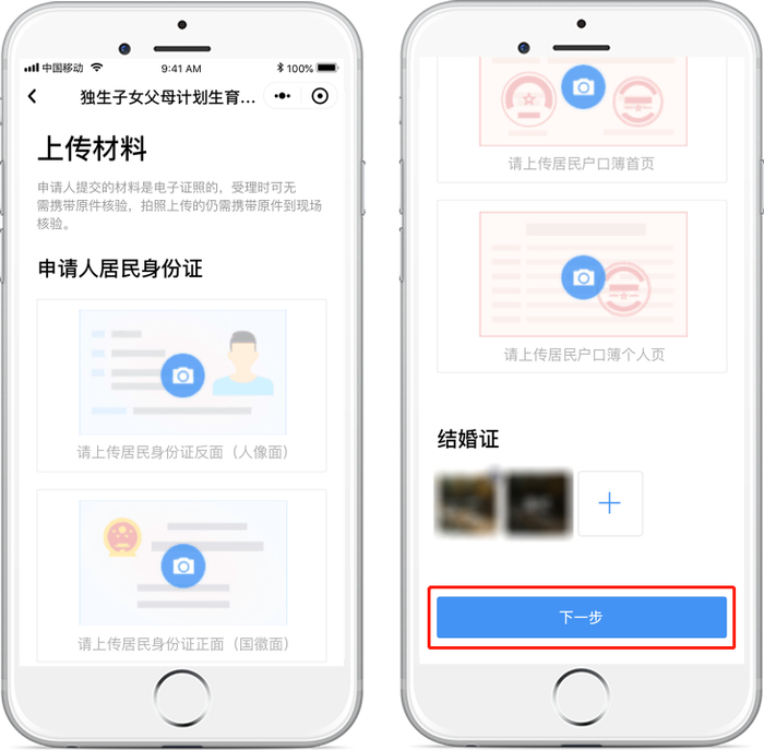 3、上传证明材料:上传申请人居民身份证、申请人居民户口簿以及结婚证,点击“下一步”。