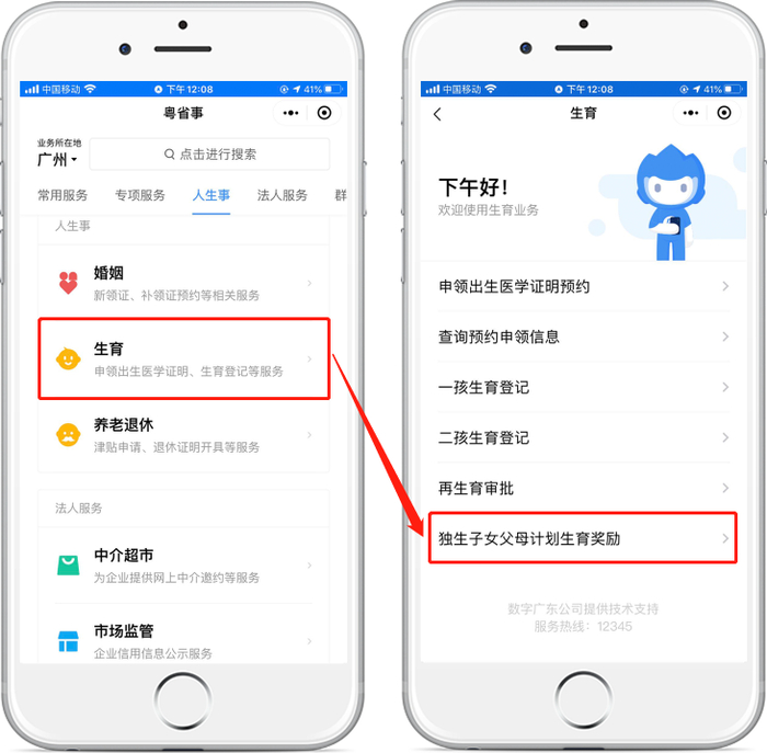 ① 微信搜索登录“粤省事”小程序,进入小程序首页左上角切换所在城市,点击右上角放大镜图标搜索“独生子女”“生育”等关键词。